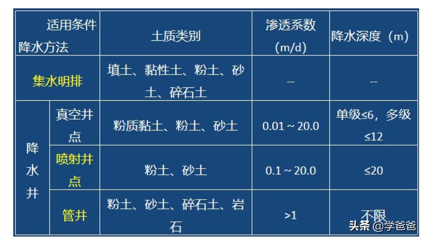 (1)降水方法应根据场地地质条件、降水目的、降水技术要求、降水工程可能涉及的工程环境保护等因素按表2k313021-4 选用,并应符合下列规定: