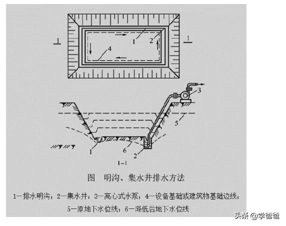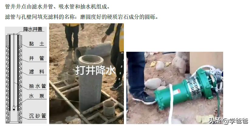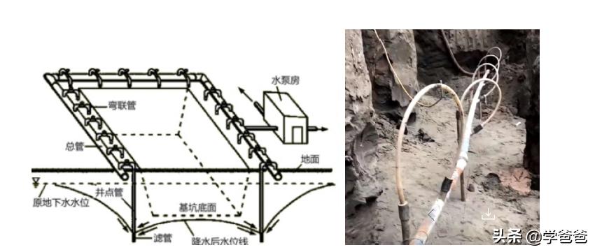 轻型井点(真空井点)是沿基坑四周将井点管埋入蓄水层内,利用真空抽水设备将地下水从井点管内不断抽出,将地下水位降至基坑底以下。