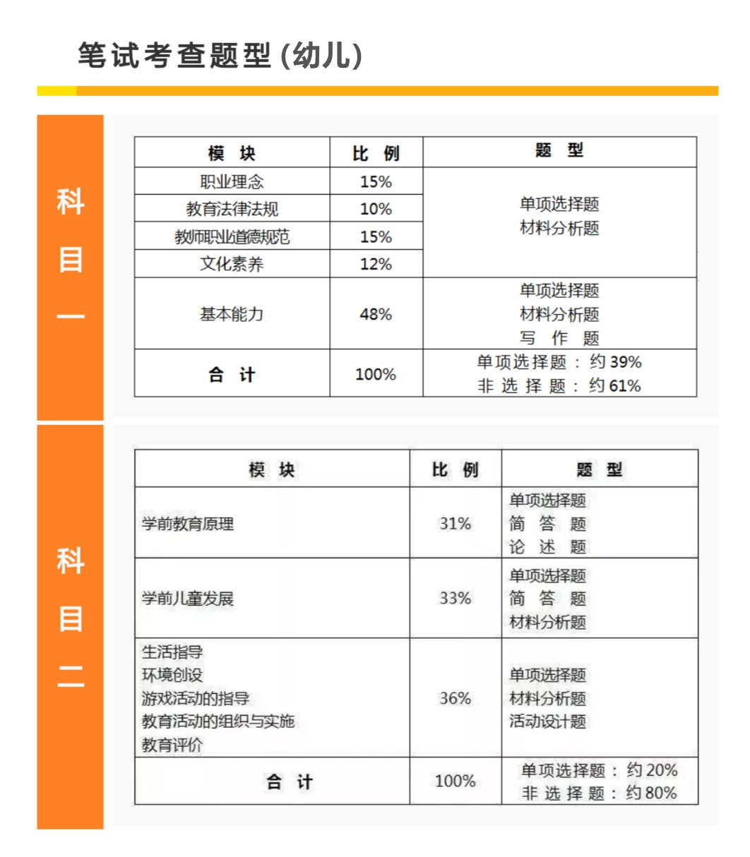 科目二《保教知识与能力》主要考查从事教师职业所需具备的学前儿童发展、学前教育原理和幼儿园教育的实施等基本知识。考试题型有:单选题;简答题;论述题;材料分析题;活动设计题。