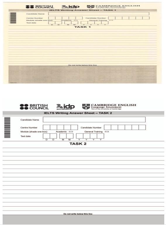 写作的答题纸共有两张,一张黄的一张白的(答题纸上会注明task 1/ task 2,如下图显示)。写作的时候一定要分清哪张纸对应写什么。写作结束后,答题册和答题纸上交,考试结束。