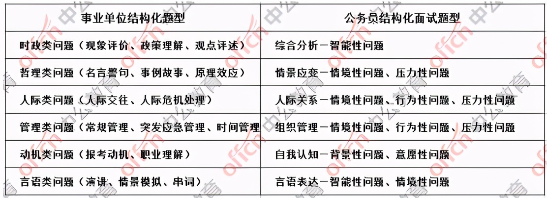 结构化面试题型上有所区别,公务员面试更注重行政综合能力的考察,对各项能力要素的考察比较全面,比较均衡,答题讲究广度和深度。