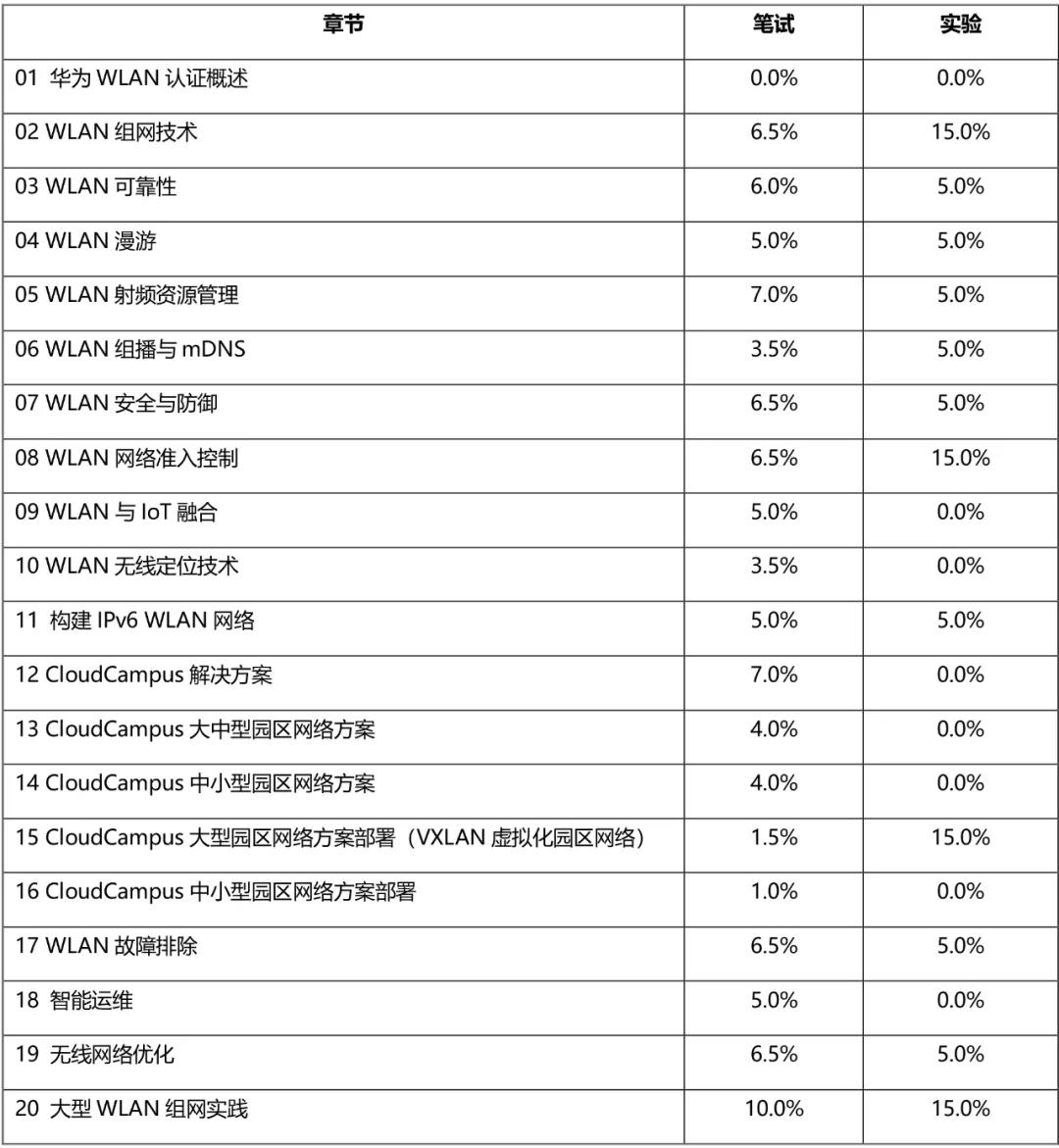 hcie-wlan考试包含wlan组网、可靠技术、设备资源管理、准入控制、安全与防御、wlan与iot、wlan定位技术、wlan ipv6组网技术、cloudcampus解决方案、故障排查、智能运维、网络优化以及网络规划等内容。
