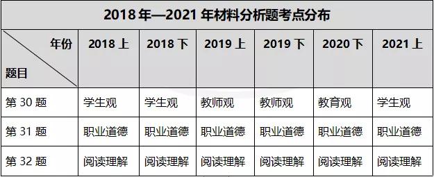 从历年的考试情况来看,职业道德和阅读理解的考查是固定不变的,变化的只有第30题——职业理念,职业理念部分每次考试只会从教育观、学生观和教师观之间选择一个进行考查。考生复习时,要吃透、牢记每个“观”的内容,并在考试时,能够结合材料,用自己的语言表述出来。