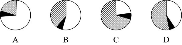 134.以下哪个饼图最能准确反映2021年1—2月c市天然气用量中,民用气(白色)、cng用气(黑色)和工业用气(斜线)的占比关系: