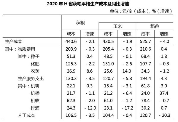 2020年h省秋粮机耕成本增量为:22.1×0.3%;机播成本增量:21.7×(-1.1%);