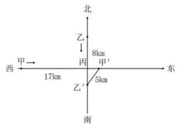【答案】d。解析:方位几何与行程问题综合。如图所示,设张的速度为5m千米/小时,则李的速度为3m千米/小时。由题意可知,张、李两人1小时后直线距离为13千米,又经过3小时后直线距离为5千米,且此时均经过了丙地,即出发4小时后张李两人分别到达图示甲,、乙,处。则根据勾股定理得,(5m×4-17)2+(3m×4-8)2=52,因两人速度均为整数千米/时,则m=1时,符合题干所有要求。因此张到达丙地需要17/5小时,即3小时24分钟,李到达丙地需要8/3小时,即2小时40分钟,故张经过丙地的时间比李晚44分钟,答案选d。
