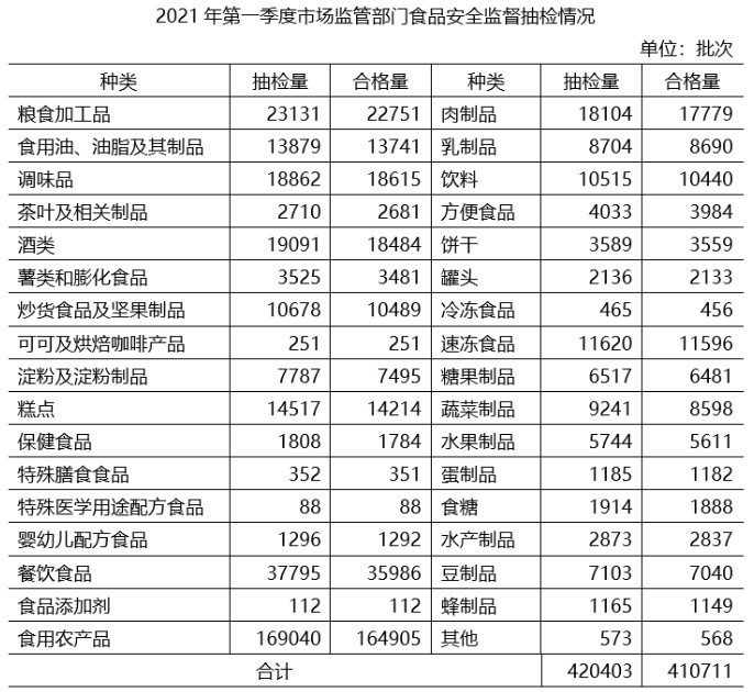 121、表中所列食品类别中,2021年第一季度所有抽检样本全部合格的有几类?