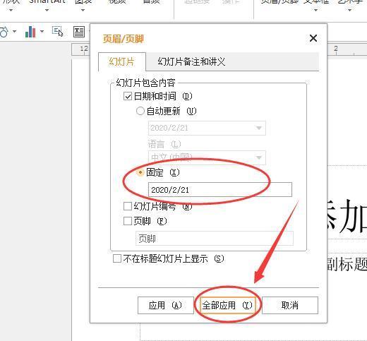 在“页眉/页脚”设置窗口中,勾选“幻灯片”选项中的“固定”并输入日期后,点击“全部应用”即可。