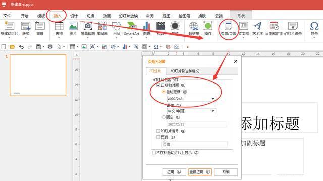 点击菜单栏“插入”中的“页眉页脚”后,在“页眉/页脚”设置窗口中,勾选“幻灯片”选项中的“自动更新”后,点击“全部应用”即可。