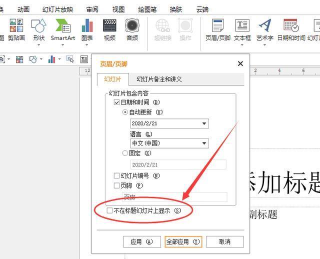 ppt的日期默认是给所有的幻灯片全部添加,如需设置封面不显示日期,在“页眉/页脚”设置窗口勾选“不在标题幻灯片上显示”即可。