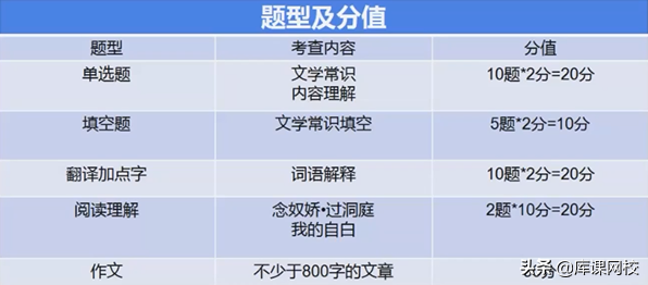 考察对古诗词和古文的掌握,主要考察艺术和内容两个方面的理解和分析,偶尔涉及默写和翻译句子(近三年没有考过)