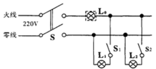 24、【单选题】如图,在保险丝处接入一个“220v40w”的灯泡l0,当只闭合s1时l0和l1都呈暗红色;由此可以确定()。